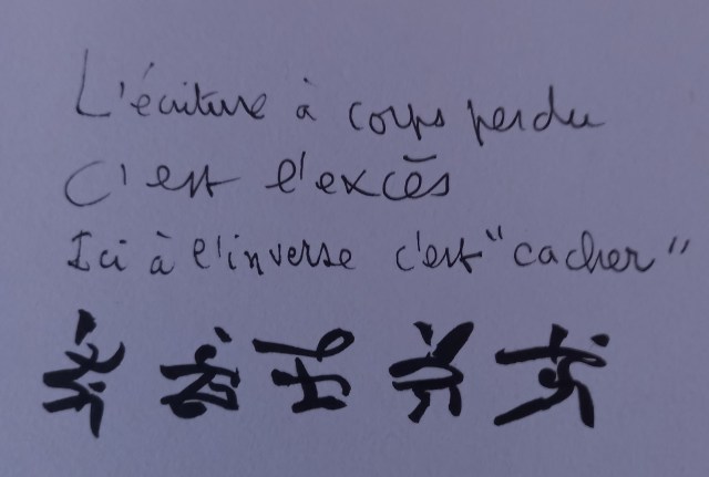 L’ÉCRITURE CACHÉE Publié par :Jean Jacques Dorio 23 Mai 202323 Mai 2023 Leave a comment on L’ÉCRITURE CACHÉE L’écriture à corps perdu C’est l’excès Ici à l’inverse c’est l’écriture cachée Partager : Cliquer pour partager sur X(ouvre dans une nouvelle fenêtre) X Cliquez pour partager sur Facebook(ouvre dans une nouvelle fenêtre) Facebook J’aime chargement… Similaire