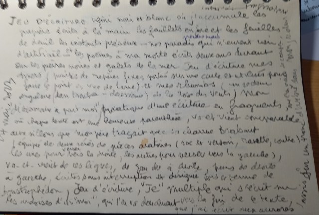 Jeu d’écriture infini noir et blanc où j’accumule les papiers écrits à la main les feuillets en joie et les feuilles en deuil les instants précieux -nos paradis perdus qui n’eurent rien d’artificiels- et les « poèmes à ma morte » écrits (deux ans durant après sa disparition) sur les pierres noires et les galets de la mer Jeux d’écritures mes amers (points de repères fixes portés sur une carte-un portulan- et utilisés pour faire le point en vue de pouvoir crier Terre !) et mes rhumbs (un secteur angulaire 1/32° de la rose des vents) un dictionnaire à part moi pratique d’une écriture en fragments où chaque texte est une heureuse parenthèse, un va-et-vient comparable aux sillons que mon père traçait avec sa charrue-brabant (équipée de deux séries de pièces aratoires- soc et versoir, rasette, coutre- les unes pour verser vers la droite, les autres, quand on est au bout du champ et que l’on renverse l’outil, pour verser vers la gauche) Jeu des boustrophédons Jeu d’écriture Je multiple qui s’écrit sur les ardoises d’un « moi » qui s’en va doucement vers sa perte, telle la fin de ce texte que j’ai écrit ce matin aux aurores assis sur un tronc d’arbre que l’on vient de couper…dans « mon jardin imparfait » Montaigne