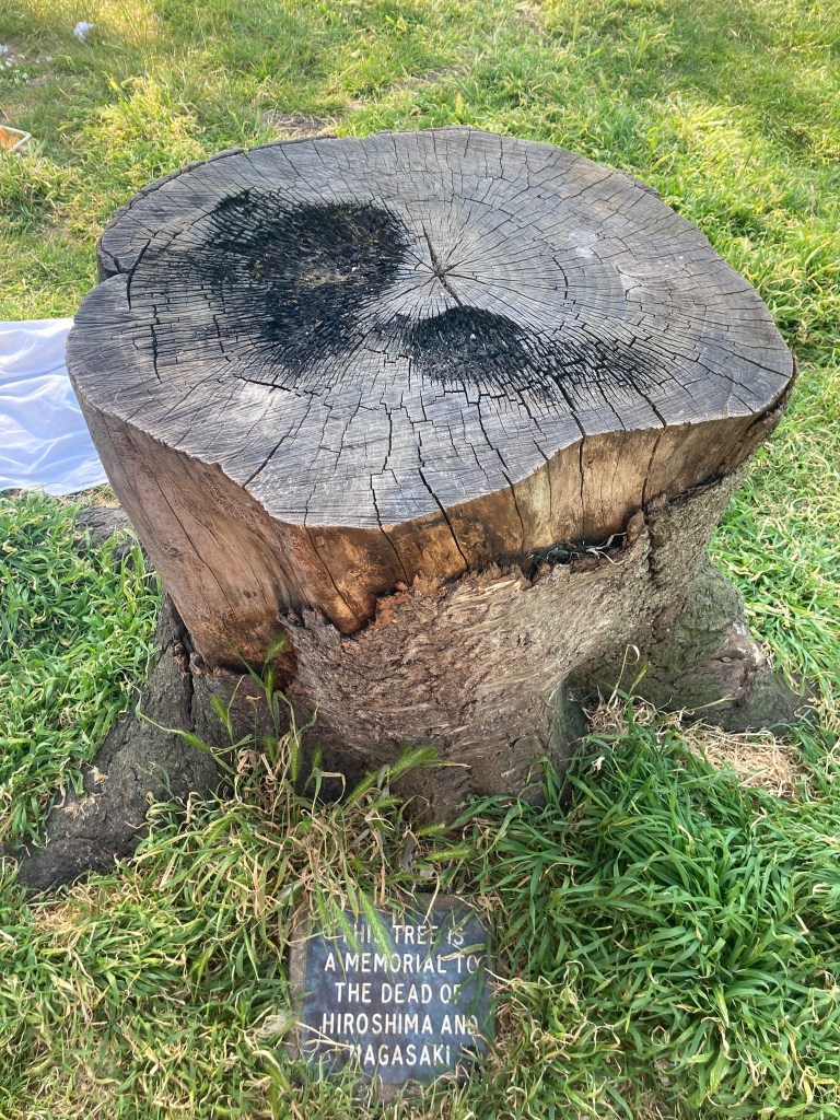 Un tronc de cinquante centimètres de haut représente tout l’arbre, mais quel arbre! J’étais par hasard adossé à lui, dans un pré, près du pont d’Hammersmith, enjambant la Tamise. Ma petite fille tournait autour jusqu’au moment où par hasard la voilà qui tombe, littéralement, sur cette inscription, incroyable à lire : This tree is a memorial to the dead of Hiroshima and Nagasaki. “ Cet arbre est en mémoire des morts d’Hiroshima et de Nagasaki.” Un jour peut-être, petite Alice, liras-tu ce texte maudit. Car ils furent maudits les enfants d’Hiroshima et de Nagasaki, ces deux jours d’août 1945, que la terreur atomique fit fondre sur le goudron de leurs cités, dans leurs maisons, dans leurs écoles. Mais en attendant, joue et tourne en toute innocence autour de l’arbre coupé court dans cette prairie. Londres jeudi 8 juin 2023.