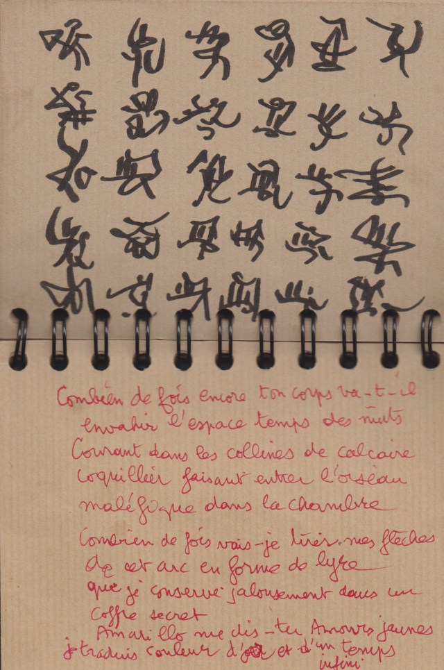 Combien de fois encore ton corps va-t-il envahir l'espace-temps des nuits Courant dans les collines de calcaire coquillier Faisant entrer l'oiseau maléfique dans notre chambre claire Combien de fois encor vais-je tirer mes flèches de cet arc en forme de lyre que je conserve jalousement dans un coffre secret Amarillo me dis-tu Amours jaunes je traduis Couleur d'or Et d'un temps infini