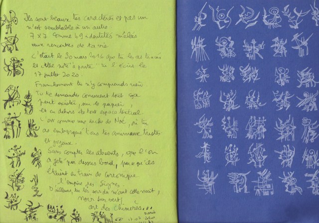 Et cette nuit tu les ressorset leur ajoute une note a partece 17 juillet 2020.Franchement tu n'y comprends rien.Tu te demandes comment tout cela peut exister,sur le papier,et en dehors de tout espace textuel.C'est comme une arche de Noéoù tu as embarqué tous tes animaux,les tristes et les joyeux.Sans compter les absents,que l'on a jeté par-dessus bord,parce qu'ils étaient entrain de corromprel'empire des signes.D'ailleurs tu en sors quelques uns du néant cette nuit,noir sur vert,comme un art en miroirde tes chimères.