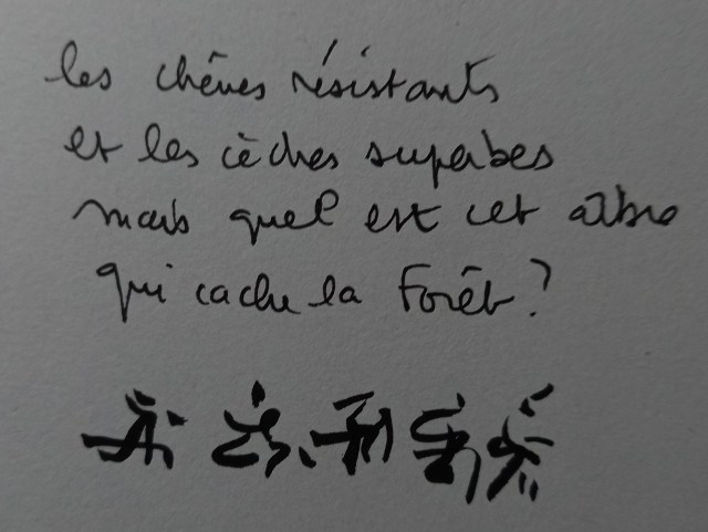 de l’arbre où poussent les neurones de notre cortex /de l’arbre transfert aérien de notre for intérieur/ de l’arbre ébranché dans un alexandrin : voici des fruits des fleurs des feuilles et des branches Verlaine/ de l’arbre qui irrigue les carnets et les cahiers de peintres qui essaient pour le figurer de prendre le recul nécessaire sur leurs pratiques millénaires/ de l’arbre de citations /de l’arbre qui cache la forêt des symboles /de l’arbre composé par les mille et un contes de la nuit : contes de survie contes de défi et chansons où l’on écrit son testament : est-il encore debout le chêne ou le sapin de mon cercueil Brassens /de l’arbre apparaissant sur la langue tirée par monsieur Einstein /de l’arbre mort de mon jardin un cerisier dont j’ai conservé le tronc et les fourches pour m’y asseoir et converser avec mes livres imaginaires qui tels l’oracle de Delphes ne révèlent pas ne cherchent pas mais signifient /de l’arbre du signifiant en ces chaos inattendus cahin caha/ de l’arbre de la barque de Francis Ponge qui s’en va couçi couça « comme tout au monde à sa perte tel un fétu »/ de l’arbre des contes populaires du petit poucet et du baron perché /des arbres de toute une vie où figurent l’écorce et la chair de nos autoportraits /de l’arbre qui s’efface et fuit la terre en feu/ de l’arbre qui déploie ses racines dans le sol jaune des amours contrariées ou perdues/ de l’arbre résistant contre vents et marées