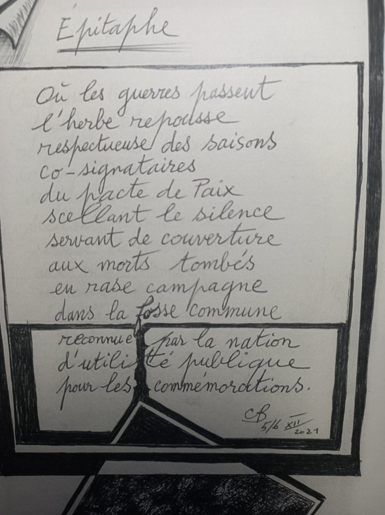 ÉPITAPHE Faute de mieux je fais des vers Des verts des jaunes des « en couleur » Je fais des vers d’amour de grâce Et de disgrâce sans valeur Pourtant je sue je m’évertue J’épuce les dictionnaires Mais depuis que je deviens vieux Je n’ai plus la faveur des dieux D’autres que moi sont honorés Leur chef orné de la couronne Du mol rameau d’un olivier Ci-gît JJ qui n’eut pas fame Fut fol usant en vain ses gammes Et pi mourut… sans épitaphe JJ Dorio En vis à vis