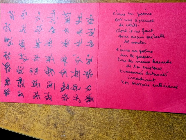 ce biscuit inactuel que l’on appelle encor – semble-t-il ? – un poème Avec la craie qui le traça sur le tableau noir de l’enfance Avec le stylo feutre bleu qui enjambe les ponts et les refrains présents Avec tes doigts de vieux copiste aimant les lettres illuminées salle des poèmes perdus