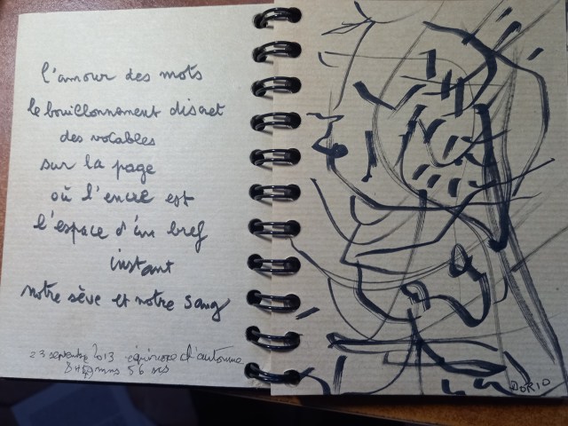 84 REVIVIFIANTE VERTU Il y a dans notre existence des points temporels qui conservent, avec une distincte prééminence, une revivifiante vertu. William Wordsworth (1770-1850) Pourquoi je veille en lisant, en écrivant, en dessinant, en faisant des signes au pinceau qui ressemblent à du chinois et que je nomme hypnographies ? Je veille chaque nuit pour faire des points d’étape d’une vie singulière et commune, pour conserver la capacité, me remémorant d’épisodes joyeux ou hachés de douleurs, de me revivifier, fuyant l’ego, le ressassement, le vieillissement du langage de mes années perdues. (Le livre d’une vie En mille et un fragments) Écriture en cours