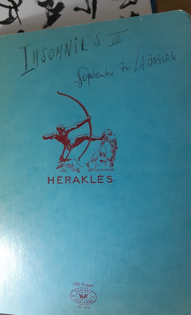 ÉCRIRELIRE J’écris le plus souvent en lisant La table rase ? merci pour moi En lisant des livres s’entend De toutes formes et de toutes couleurs de tout propos qui parlent déparlent Me sortent des yeux et des mains Où à l’inverse me pénètrent l’âme Ce mot honni des grands Esprits Mais ce matin après avoir écrit « Énergumènes » Dans la marge d’une page de mes hypnographies En feuilletant un abécédaire inspiré J’ai fait cet ajout les yeux uniquement fixés Sur la page quadrillée de ce cahier d’écolier De la marque « Héraklès » 180 pages Commencées –qui me croira ?- en septembre 1970 À La Bastide de Besplas (Ariège) après mon retour de Coopération 1968-70 de Caracas (Venezuela) La photo ci-jointe de la couverture Atteste que le dieu maudit par l’épouse de Zeus Dont pourtant il porte le nom Héra-klês (Gloire d’Héra) A été croqué par le sculpteur Bourdelle Le cahier contient 180 pages Les 23 lignes que je viens de lui consacrer ne l’ont pas encore épuisé (05/06/2020 07h15)