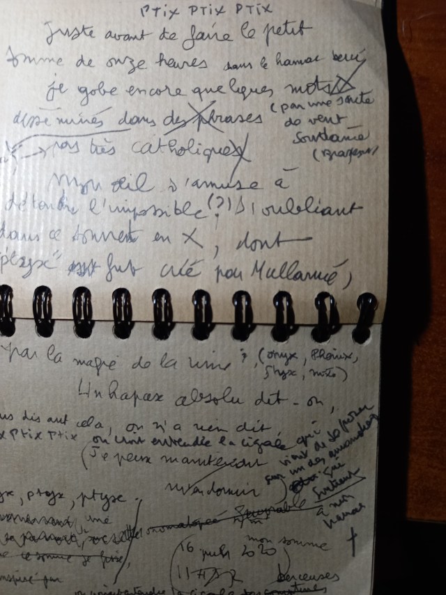 Juste avant de faire la petite sieste dans le hamac bercé par une saute de vent soudaine (Brassens), je grapille encore quelques mots disséminés dans un poème pas très catholique. Mon œil s’amuse à détendre l’impossible (une expression qui semble dénuée de sens mais qui m’a échappée), s’oubliant dans ce sonnet en X, qui par « la magie de la rime » (onyx, phénix, Styx, nixe) permit à Mallarmé d’inventer le mot ptix : un hapax absolu, dit-on. Mais, miracle de l’instant et foin des mots savants, une cigale vient me visiter, qui sur un des amandiers servant de support au hamac, se met à gratter ses ailes. Ptix, ptix, ptix, un délice de berceuse qui m’endort derechef…16 juin 2020 et 11 septembre 2023