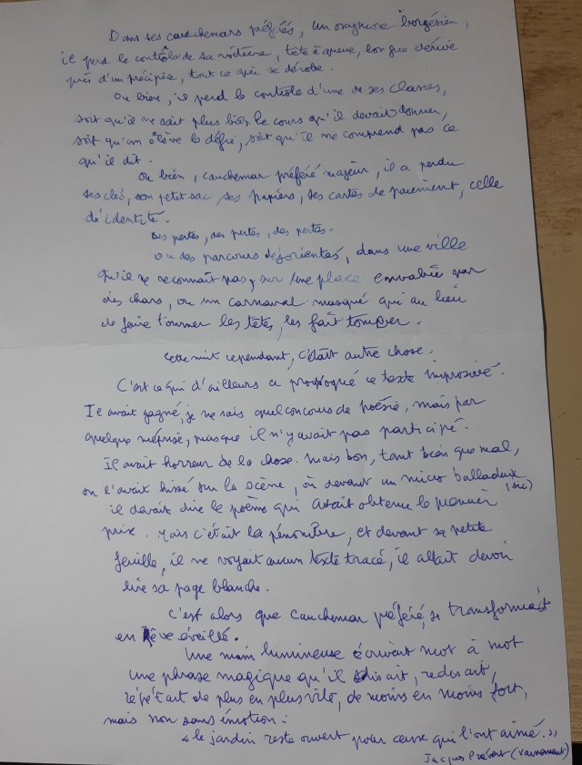 Ou bien, cauchemar préféré récurrent, il a perdu ses clés et ne peut entrer dans sa maison, il a égaré son petit sac dans un magasin, une librairie ou en l’oubliant sur la plage où il a l’habitude de faire de longues balades, mais aussi de s’asseoir longuement à l’abri d’un rocher en rêvant, il n’a plus sur lui ses papiers d’identité, ses cartes de paiement, bref tout le tremblement.