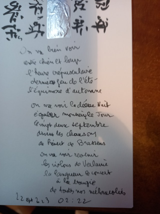 on va bien voir entre chien et loup l’heure crépusculaire du dernier feu de l’été on va mesurer l’équinoxe d’automne de la déesse Nuit égalant le jour réduit ce vingte deux septembre de la chanson de Brassens et des amours mortes du père Prévert on va voir revenir les violons de Verlaine la langueur le concert à la bougie de toutes nos mélancolies Jean Jacques Dorio 22 septembre 2023 02 :22
