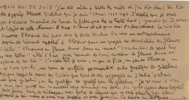 J’OUBLIE QUI JE SUIS J’ai dit adieu à toutes les nuits où j’ai dit dans ton lit Petit esprit Please Oublie qui je suis Arno (1949-2022) J’oublie qui je suis Façon d’écrire Manière de lancer la fabrique de ce texte dont j’ignorais qu’il avait fait l’objet des paroles de ce chanteur qui vient de disparaître (comme on dit) Arno c’était pour moi, avant que l’écran ne me donne l’info, exclusivement ce petit fleuve qui traverse Firenze et passe sous le ponte vecchio On voit un extraordinaire dessin de Leonard, qui fut appelé par les florentins pour un projet de dérivation, intitulé « Placement du fleuve Arno dans un canal » ou bien aussi on peut lire dans une lettre de Machiavel « allé à Pise avec Leonard de Vinci niveler le fleuve Arno et le déplacer de son lit » Les travaux commencèrent mais l’Arno ne voulut pas sortir de son lit Grands esprits Please Oubliez qui je suis