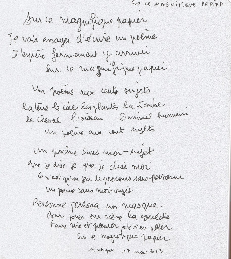 J’OUVRE UN LIVRE pour y piquer quelques lignes pour m’y perdre pour y laisser intactes ses alouettes vers l’infini et Orphée au paradis J’ouvre un livre un serpent y dormait un sonnet y tournait remuant ciel et terre de la pampa argentine J’ouvre un livre à vrai dire c’est ma vie unique à vrai dire c’est la prochaine citation le rendez-vous elliptique : c’en est fini de venir au secours des images d’hier J’ouvre un livre douleurs de l’amour doux heurts petits secrets d’abord crus puis étouffés J’ouvre un livre blanc c’est mon autoportrait ce jeudi onze mai de l’an deux mille vingt-trois J’ouvre un livre où méditent les approches approximatives d’un enfant d’un homme d’une femme d’un kiosque où les miroirs du numérique ont remplacé le papier journal J’ouvre un livre embrouillé de pages de lignes et de propos : il y a énormément d’étoiles peut-être trop J’ouvre un livre écumeux salé vagabond bruissant tournoyant navigable indigné inconstant soucieux pacifique dérobé J’ouvre un livre apparemment réel apparemment rêvé celui de ma vie unique longtemps confondue avec celle des autres Un livre de sable de calcaire et de battements d’Elle mon Alice qui dort depuis mille ans entre ses pages vierges
