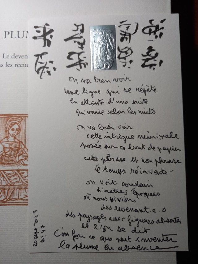 on va bien voir une ligne qui se répète en attente d’une suite qui varie selon les nuits on va bien voir cette intrigue minimale posée sur ce bout de papier cette phrase et non-phrase ce temps réinventé on voit soudain d’autres époques où nous vivions on voit des revenant.e.s des paysages avec figures absentes et l’on se dit en aparté c’est fou ce que peut inventer une plume en absence Jean Jacques Dorio Martigues 20/09/2023 07 :20