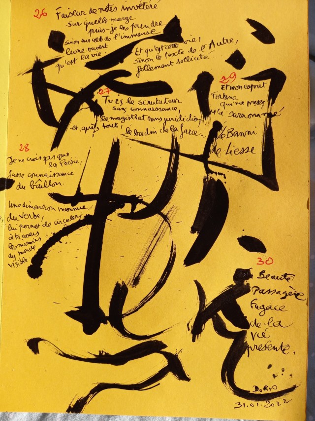 JE ME PERDS DANS LA PAGE des partis pris de Ponge de l’huître au gosier de nacre et de son obsession pour la tiare bâtarde Je me perds dans Michaux Cloué au lit par une méchante fracture me voilà inventant toute une cavalerie qui passe après la bataille Je me perds dans l’ange sombre de la Melancholia d’Albert Dürer mélas : noir kholè : bile Obscurités non obscures Je me perds dans l’éternité retrouvée la mer allée avec le soleil le pavé disjoint de la cour de l’hôtel de Guermantes Je me perds pour mieux me retrouver dans les pages de Ponge faisant face avec Michaux à ce qui se dérobe le soleil noir de la mélancolie l’éternité de Rimbaud la vocation révélée au narrateur de la Recherche