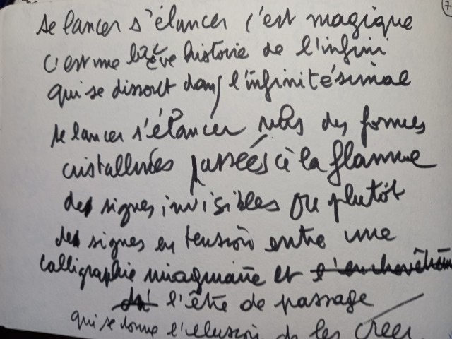se lancer s’élancer c’est magique c’est une brève histoire de l’infini qui se dissout dans l’infinitésimal se lancer s’élancer vers des formes cristallines passées à la flamme de signes invisibles ou plutôt de signes en tension entre une calligraphie imaginaire et l’être de passage qui se donne l’illusion de les créer (si on me le demande je suis incapable de décrire mes gestes acquis par une longue et déraisonnable pratique et non par une étude livresque de la calligraphie chinoise)