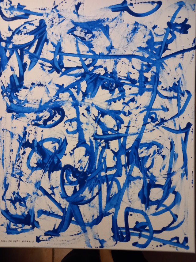 J’y vois des écritures mouvantes des visages des regards mystérieux des étoffes aussi où se lover s’emmitoufler et des couleurs des couleurs en gerbes en guirlandes en frises une déclinaison proche du bonheur J’y vois aussi Une trace Une manière de réécrire sa douleur en couleurs inscrites dans un tableau Danielle Nabonne 27/08/2023 Un tableau 50x70 Fait avec des acryliques Des « hypnographies » Et des collages de dessins noirs Avec une branche dorée Titre : cien años de soledad Dorio 30/12/2017